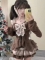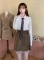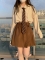 唯你复古甜美可爱拼接荷叶边收腰显瘦一字肩上衣高腰蛋糕短裙褐色套装